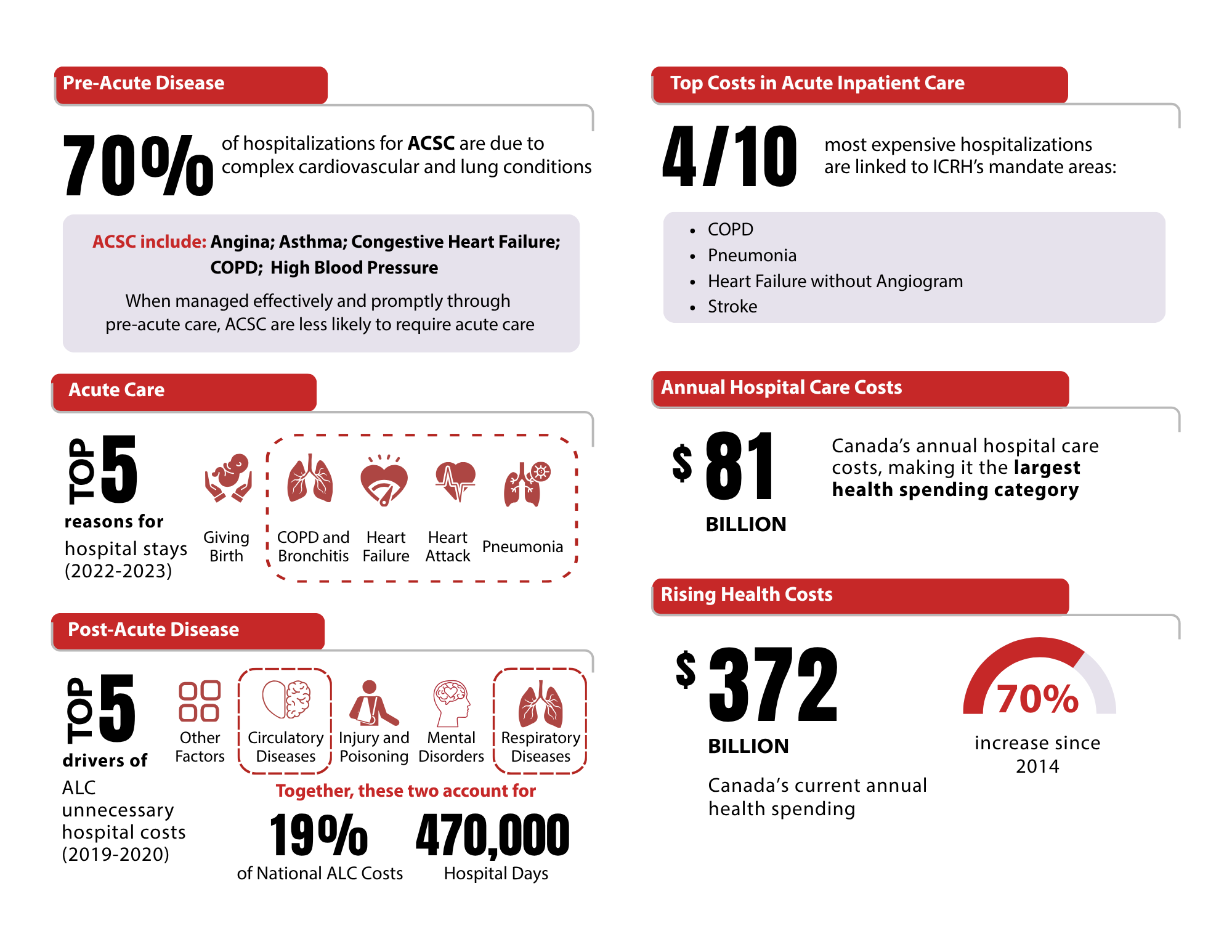 Ambulatory Care Sensitive Conditions (ACSC), including angina, asthma, congestive heart failure, chronic obstructive pulmonary disease (COPD), and high blood pressure, can be managed through timely pre-acute care.Footnote 4 Yet, about 70% of ACSC hospitalizations are still due to cardiovascular and lung conditions,Footnote 4 contributing to four of the top five reasons for hospital stays.Footnote 5 More broadly, circulatory and respiratory diseases are two of the top five drivers of costs related to Alternate Level of Care (ALC), in which patients no longer need acute care but remain in hospital, accounting for 19% of the national total ALC costs and representing 470,000 unnecessary hospital days.Footnote 6 These are not just health statistics, they are missed opportunities. Missed chances to intervene early, to connect research with bedside, and to harness innovation and digital tools to transform care delivery.