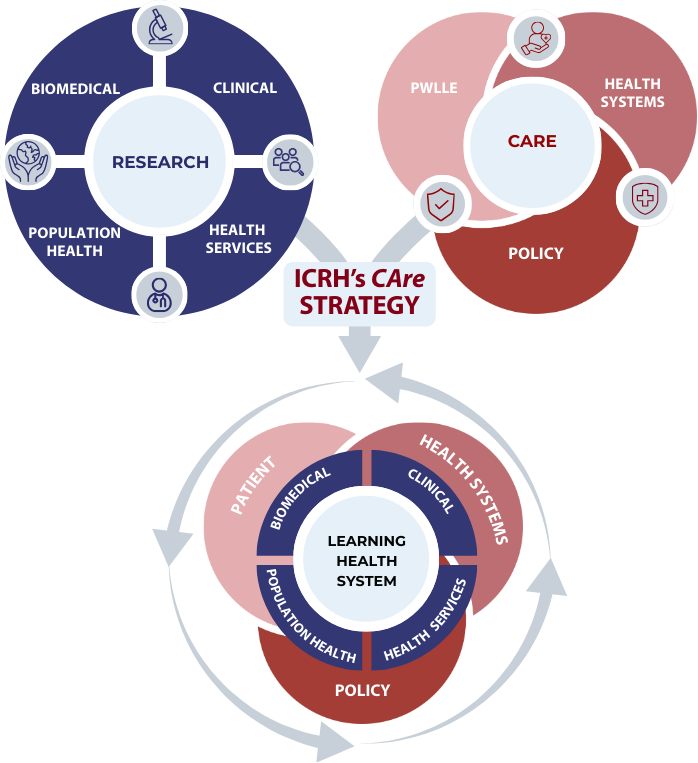 - A two-headed arrow connects the Research (blue circle) and Care (red circle) sections at the top of the diagram, and funnels downward through the central box labeled ICRH's CAre Strategy. From the central box, the arrow continues downward into the Learning Health System circle at the bottom. Surrounding the Learning Health System circle, a circular flow arrow wraps around the entire section.