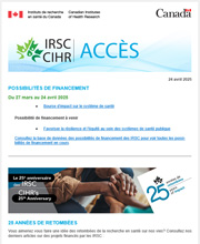 Le bulletin Accès (anciennement appelé « Info-financement ») est le bulletin mensuel des IRSC transmis par courriel à la communauté de recherche et à d’autres personnes intéressées par la recherche en santé. Le bulletin Accès est axé sur les possibilités de financement et les décisions connexes, les renseignements sur le programme, les occasions d’apprentissage et plus encore.