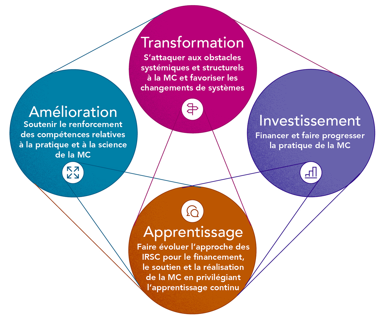 - Transformation : S'attaquer aux obstacles systémiques et structurels à la pratique de la MC et favoriser les changements de systèmes