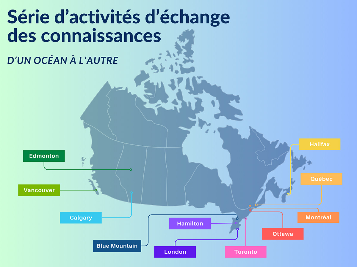 Carte du Canada avec le titre « Série d’activités d’échange des connaissances – D’un océan à l’autre » en bleu foncé à gauche. La carte indique dix villes avec des étiquettes colorées reliées par des lignes : Vancouver (vert lime), Edmonton (vert foncé), Calgary (bleu pâle), Blue Mountain (bleu foncé), London (violet), Hamilton (mauve), Toronto (rose), Ottawa (rouge), Montréal (orange), Québec (jaune orangé) et Halifax (jaune). L’arrière-plan présente un dégradé allant du vert pâle à gauche au bleu pâle à droite.