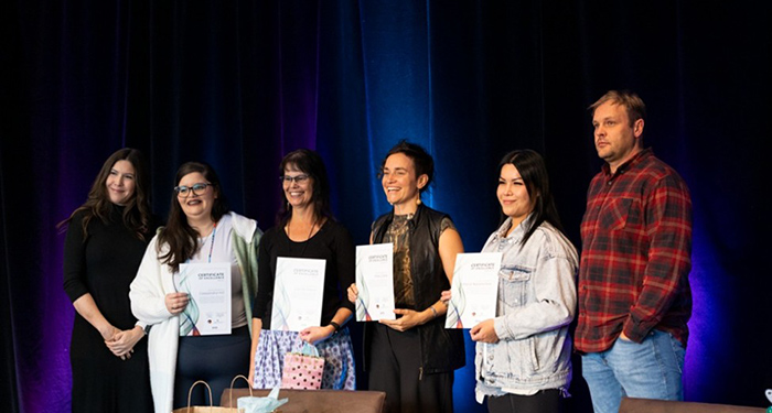 De gauche à droite : La Dre Chelsea Gabel (directrice scientifique, de l’Institut de la santé des Autochtones des IRSC), Cassandra « Cassie » Hill, Laurie Sherry, Moe Clark, Sheila Naytowhow et le Dr Robert Henry (président du Centre national de coordination du programme ERRSA).