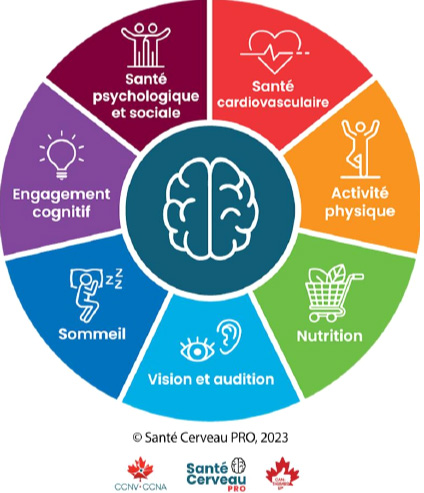 - En outre, l'équipe de la mobilisation des connaissances et le stagiaire George Philip (financé par une subvention du Fonds de recherche du Québec – Santé) ont créé l'infographie « Santé Cerveau PRO - l'ensemble des modules » afin de diffuser des connaissances et des conseils en matière de santé cérébrale relatifs à sept catégories : le sommeil, la vision et l'audition, la nutrition, l'activité physique, la santé cardiovasculaire, la santé psychologique et sociale, ainsi que l'engagement cognitif.