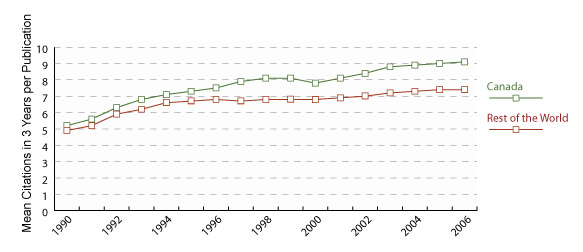 - Figure 3: Mean number of citations of publications, Canada versus rest of the world, 1990–2006