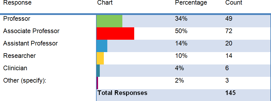The reviewers were comprised of Mid-Career (45%) and Senior (42%) Scientists primarily from the Biomedical research domain (79%). Half of the respondents are Associate professors (50%) while 34% are Professors.