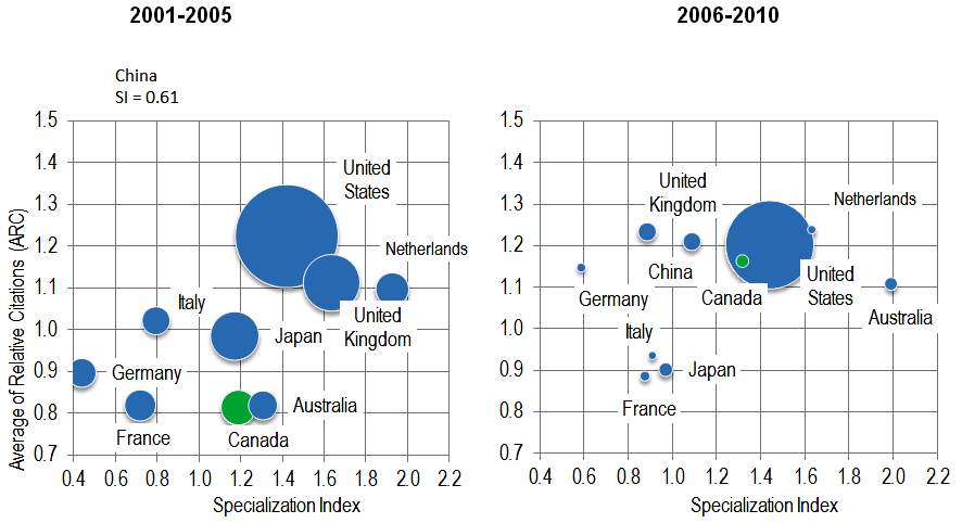 An important indicator of scientific performance is the impact that the published papers have on the scientific community. The Average of Relative Citations (ARC) is an indicator of the number of times that a paper is cited relative to the world average. Specialization Index (SI) is an indicator of the relative research intensity of publication of a country in an area of interest relative to the intensity of the world in that specific area. Looking at these two indicators gives us a graphical representation of the relation between knowledge creation and scientific impact. The scatterplot diagrams presented in Figure 1-1 compares the ARC and SI of the top ten productive countries in pandemic research for the period before PPSRI was implemented (2001-2005) with the period after its implementation (2006-2010). The comparison of these two figures shows that Canada has increased its specialization as well as its impact since the PPSRI started. From 2001-2005 to 2006-2010, Canada’s SI in the area of pandemic increased from 1.18 to 1.31 and its ARC, from 0.81 to 1.16.