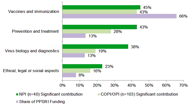 PPSRI funded projects produced a variety of research and commercialization outcomes in each research area of interest. Over a third of projects researching vaccines and immunization produced results that could lead to a new vaccine or drug. A couple of examples are: early detection of influenza variants and their correlation with variation in vaccine effectiveness, studies which identified that current vaccines are not as effective in the elderly, leading to the development of better vaccines for this age cohort. Three-quarters of the projects researching virus biology and diagnostics resulted in new research methods, patents and licenses, or intellectual property claims.
