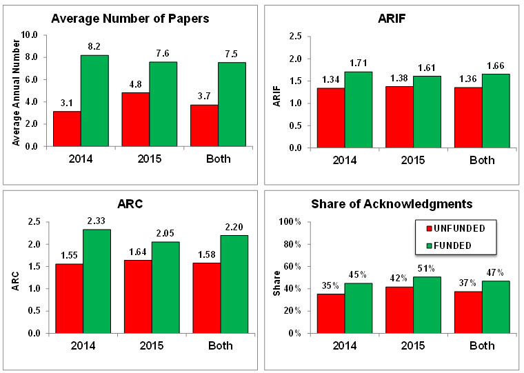 - Along the same lines, impact indicators show that funded applicants published in more visible journals (ARIF = 1.47) than their unfunded colleagues (1.33) and that their papers are also more cited (ARC = 1.73 vs 1.49).