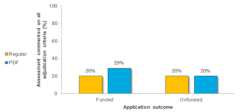 Figure 8 shows the percentage of Regular versus PDF assessments that commented on all of the DRA adjudication criteria across funded and unfunded applications.