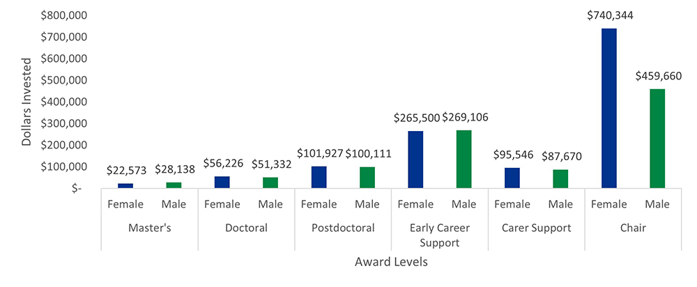 The evaluation found that the majority of CIHR's direct training support is provided at the Postdoctoral level, whereas the majority of direct career support is provided through research grants. The evaluation concludes that CIHR needs to better define, align, and monitor training and career support activities and investments in relation to the CIHR Act and next strategic plan. CIHR's investments in direct training and career support award programs have decreased from $87M in 2000-01 to $45M in 2015-16. There are some funding differences based on sex and language: more females have been funded across training levels and more males have been funded at the career support levels, and females have received higher average award amounts at the Chair level. The majority of funded applications are in English and more than half of funded applications have a Biomedical focus. With respect to design features of current direct award programs, CIHR award amounts and duration are on par with Tri-agency and international awards at the Doctoral level; however, they are lower at the Postdoctoral level. At the Master's level, they are on par with the Tri-agency and lower than international awards.