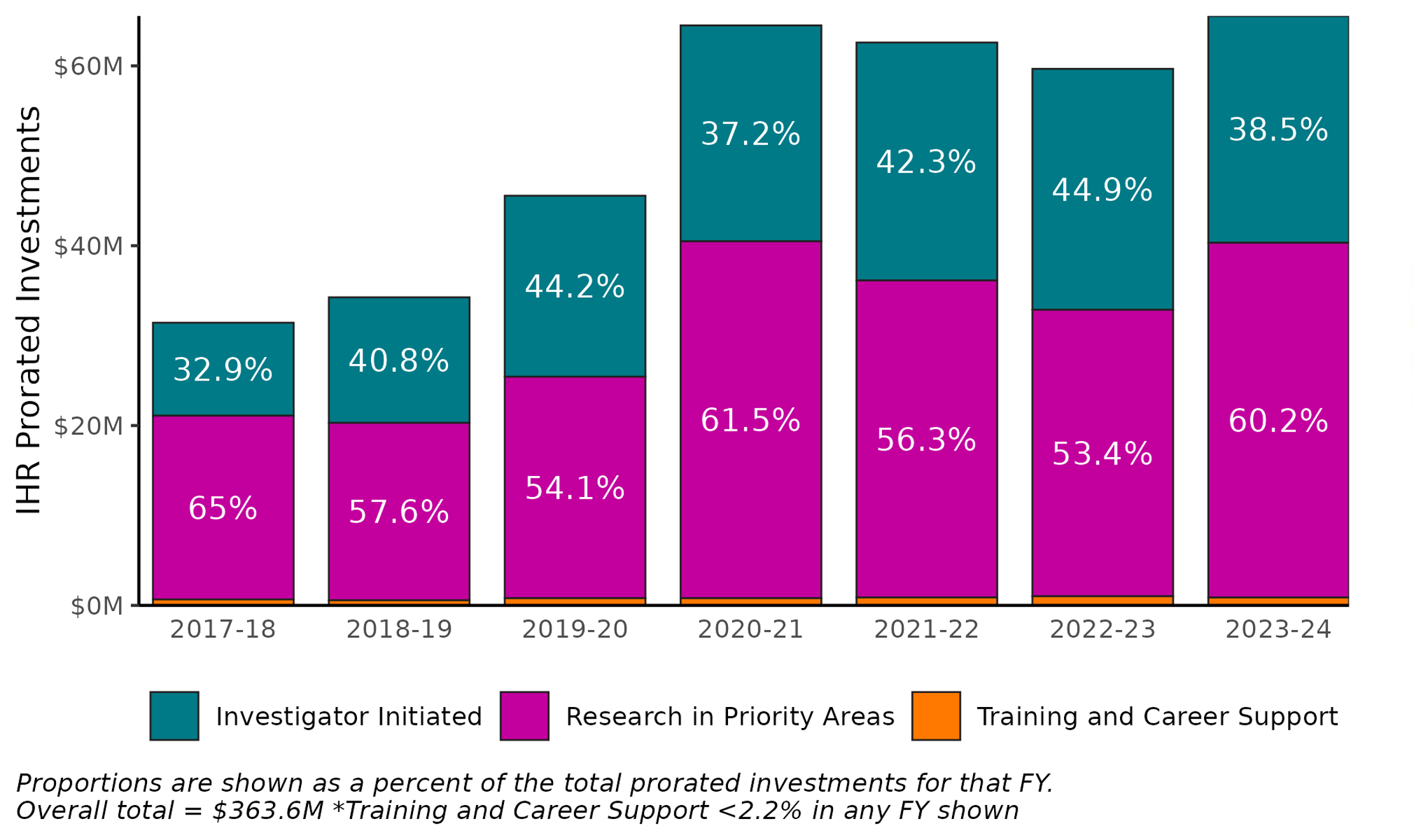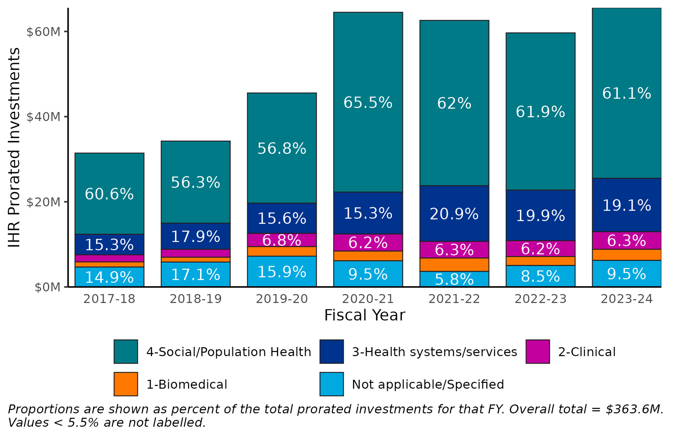 IHR investments may vary annually and over time, as they are calculated based on in-year IHR-relevant expenditures relative to total CIHR Grants and Awards expenditures. Sustaining these investments depends on a steady flow of new IHR-relevant applications, highlighting the importance of continued capacity-building in IHR.