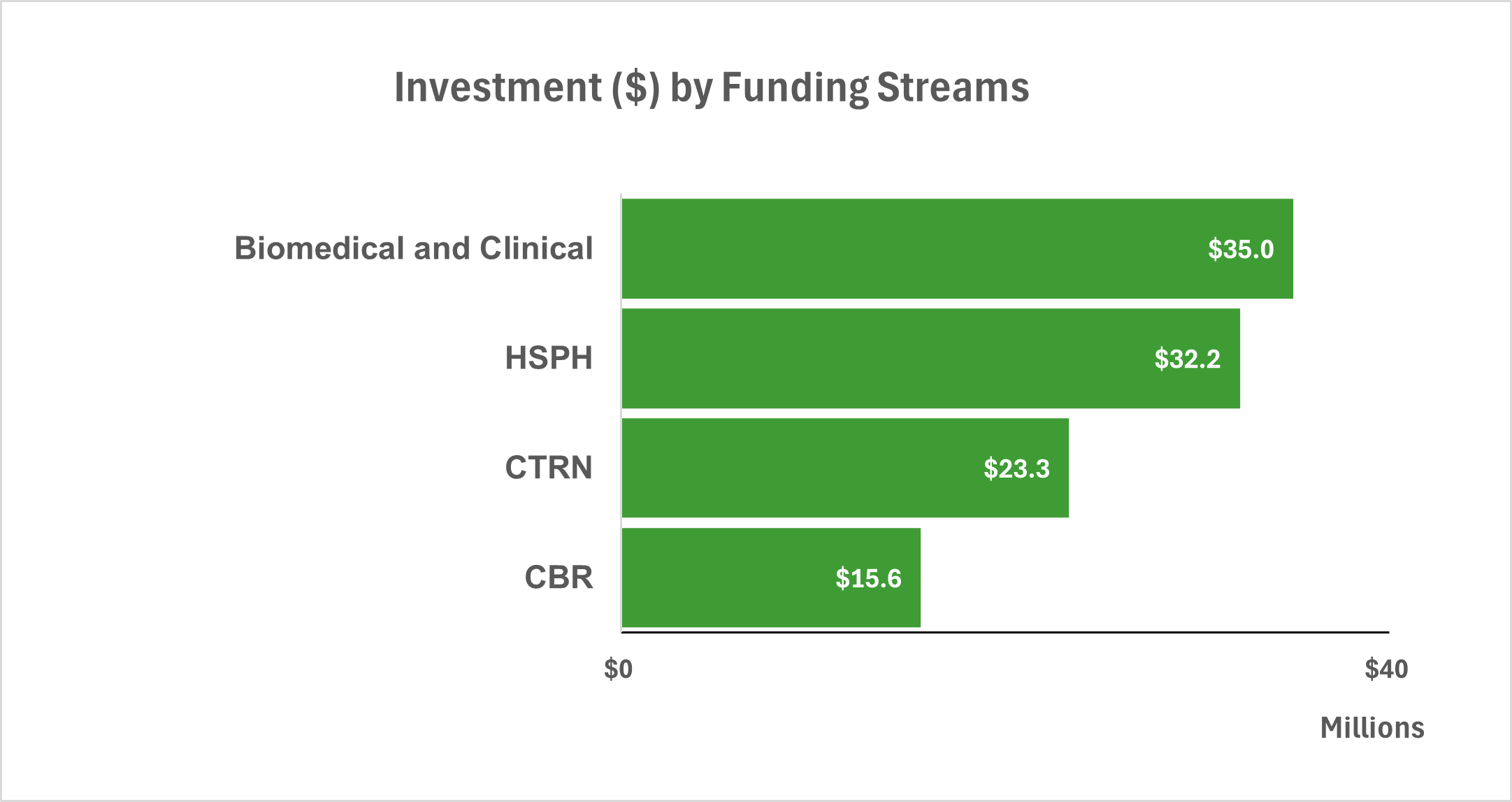 CIHR's HIV/AIDS and STBBI Research Initiative (RI) was initiated as part of the major Government of Canada's response to HIV/AIDS launched in 2005 through the Federal Initiative to address HIV/AIDS in Canada (FI). The FI was coordinated between four federal departments (i.e., Public Health Agency of Canada [PHAC], CIHR, Health Canada, and Correctional Services Canada), with CIHR managing the research components of the FI. The RI provides $21 million of ring-fenced investment annually RI funding is disbursed through four funding streams: Biomedical and Clinical Research, Health Services and Population Health Research, Community-Based Research, CIHR Canadian HIV Trials Research Network.