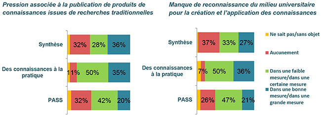 - La conduite de projets de recherche en ACi et l'application des résultats de recherche ne cadrent pas bien avec les mesures du rendement que les universités utilisent pour évaluer la réussite des chercheurs individuels. Plus particulièrement, la production d'extrants de recherche non traditionnels et le déploiement d'efforts supplémentaires pour l'établissement de partenariats et pour les activités de dissémination ne sont pas suffisamment reconnus. Ce désalignement a engendré une tension systémique entre l'exécution de l'AC et l'avancement de carrière comme chercheur universitaire.