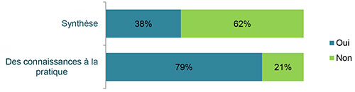 La synthèse représente la mise en contexte et l'intégration des résultats de recherche des études individuelles dans l'ensemble des connaissances sur le sujet. Elle regroupe un ensemble de méthodes mises au point pour mettre en évidence les connaissances acquises dans un secteur ou domaine donné et les lacunes qu'elles présentent. La synthèse a pour principe d'aider à l'application de connaissances scientifiques exactes et mises rapidement à la disposition des travailleurs sur le terrain qui en ont besoin. Les études sur la synthèse des connaissances peuvent s'avérer utiles pour les responsables des politiques, les représentants de l'industrie, les cliniciens, les praticiens, etc. Parfois, des utilisateurs des connaissances (UC) peuvent participer à tout le processus de recherche sur la synthèse des connaissances. C'est ce que les IRSC nomment « l'AC intégrée ». La possibilité de financement (PF) Synthèse des connaissances a pour fonction de financer ce type de recherche, laquelle est menée selon une approche d'AC intégrée (ACi).