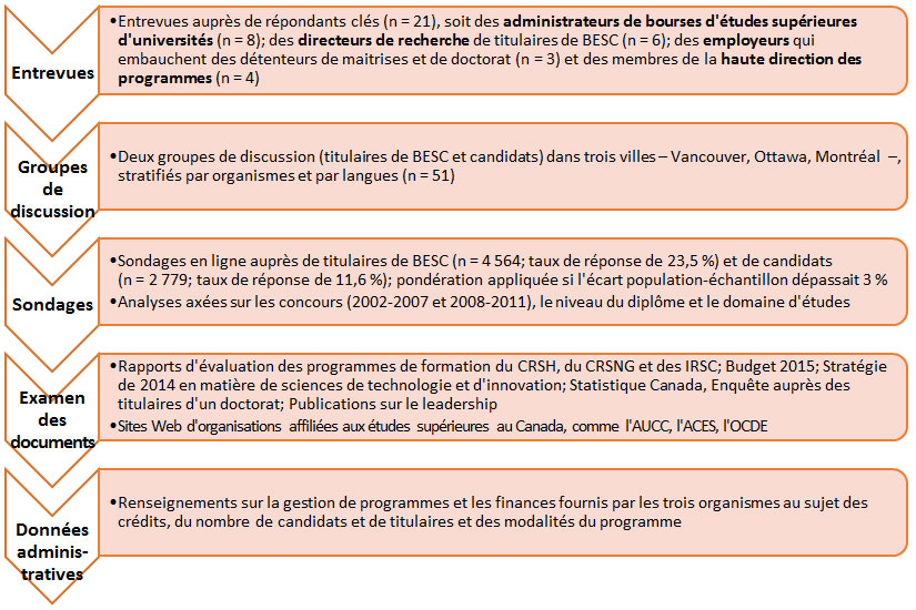 Plusieurs méthodes de collecte de données ont été utilisées afin d’effectuer une triangulation des résultats, notamment un examen des documents et des données administratives, des entrevues auprès de répondants clés, des groupes de discussion et des sondages auprès des récipiendaires et des candidats.