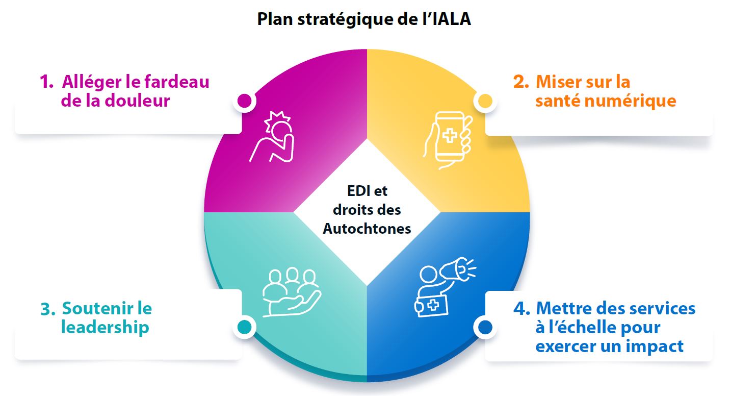 Plan stratégique de l’IALA : Pour améliorer la santé de la population canadienne, l’IALA des IRSC centrera ses efforts des cinq prochaines années sur les quatre secteurs prioritaires qu’il a désignés : alléger le fardeau de la douleur, miser sur la santé numérique, soutenir le leadership et mettre des services à l’échelle pour exercer un impact.