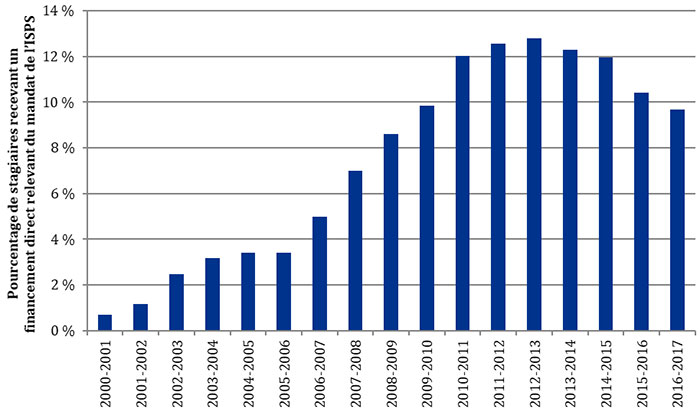 | Pourcentage de stagiaires recevant un financement direct relevant du mandat de l’ISPS | 1 % | 1 % | 2 % | 3 % | 3 % | 3 % | 5 % | 7 % | 9 % | 10 % | 12 % | 13 % | 13 % | 12 % | 12 % | 10 % | 10 % |
