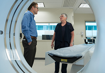 Steven Boyd, directeur de l’Institut McCaig, s’entretient avec une participante à la recherche au sujet du tomodensitomètre du MoJo. Photo de Don Molyneaux