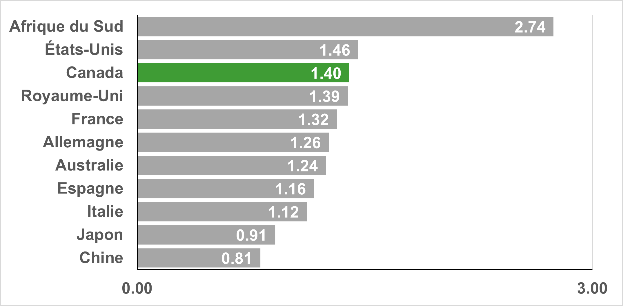 Figure 4 : Classement des dix premiers pays selon la moyenne des citations relatives (MCR) des publications, tous domaines liés aux ITSS confondus (2004-2022)