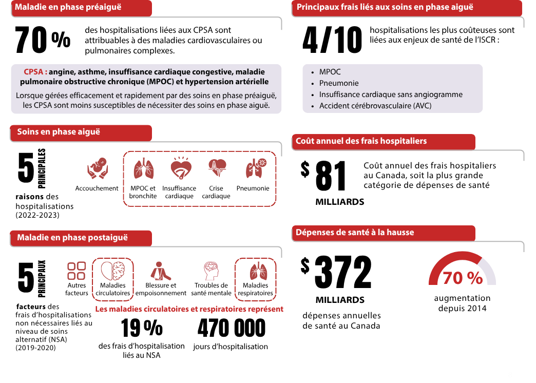 Il est possible de gérer, grâce à des soins en phase préaiguë dispensés en temps opportun, les hospitalisations pour des conditions propices aux soins ambulatoires (CPSA), comme l'angine, l'asthme, l'insuffisance cardiaque congestive, la maladie pulmonaire obstructive chronique (MPOC) et l'hypertensionNote en bas de page 4. Toutefois, environ 70 % des hospitalisations pour des CPSA sont encore attribuables aux maladies cardiovasculaires ou pulmonairesNote en bas de page 4, ce qui contribue à quatre des cinq principales causes d'hospitalisationNote en bas de page 5. Plus généralement, les maladies cardiovasculaires et respiratoires figurent parmi les deux principaux facteurs d'augmentation des coûts liés au niveau de soins alternatif (NSA), où les patients n'ont plus besoin de soins en phase aiguë, mais demeurent à l'hôpital, ce qui représente 19 % des coûts totaux liés au NSA à l'échelle nationale et 470 000 jours d'hospitalisation non nécessairesNote en bas de page 6. Il ne s'agit pas seulement de statistiques relatives à la santé, mais plutôt d'occasions manquées, des occasions manquées d'intervenir tôt, d'établir un lien entre la recherche et le chevet des patients, et de mettre à profit l'innovation et les outils numériques pour transformer la prestation de soins.